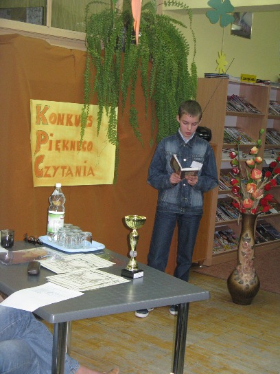 Szkolne koło teatralne zaprezentowało przedstawienie pt. „Książki Grzesia”. Uczniowie klas IV – VI pokazało swe zdolności aktorskie podczas prezentacji reklamy zachęcającej do czytania książek. Zwycięską klasą została kl.IVa wygrywając puchar. Natomiast uczniowie gimnazjum przystąpili do konkursu pięknego czytania. Przedstawiciele wszystkich klas przybliżyli nam fragmenty lektur szkolnych. Puchar otrzymała klasa IIId, reprezentowała ją Joanna Marchlewska.